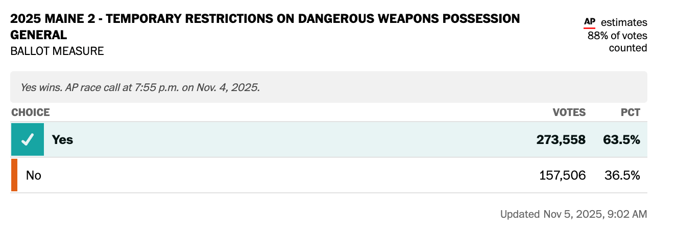 In addition to the ballot initiative to keep people from voting that lost in Maine, Question #2, a red flag law, passed by an overwhelming, landslide majority: