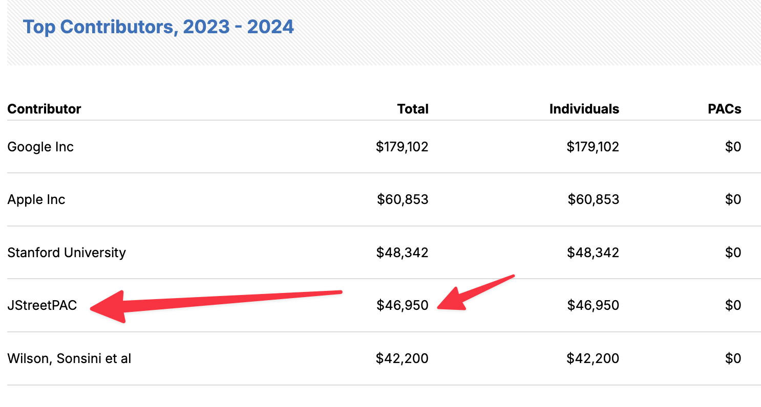 These “top contributor” charts use the employer of the person making the donation to attribute that donation to a corporation. Khanna got a lot of money from people employed by JStreet PAC, but the PAC itself didn’t give him anything. That’s a bit too clever. Anyway, Khanna is throwing down a marker here, something the real “big name” progressives like AOC have not done (not that I would expect them to).
