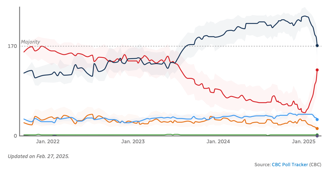 Most of this is due to the Canadian Tory leader Pierre Poilievre being considered likely to sell out Canada, and not meeting the moment because he’s just a sloganeer (“verb the noun” is a taunt made about his slogans). Liberal appear to be uniting behind Mark Carney as leader. Carney is the former governor of the Bank of Canada and Bank of England, worked for Goldman, etc. In other words, he’s going to be the white, male, somewhat conservative leader that the Liberals think can appeal to a broad swath of Canadians.