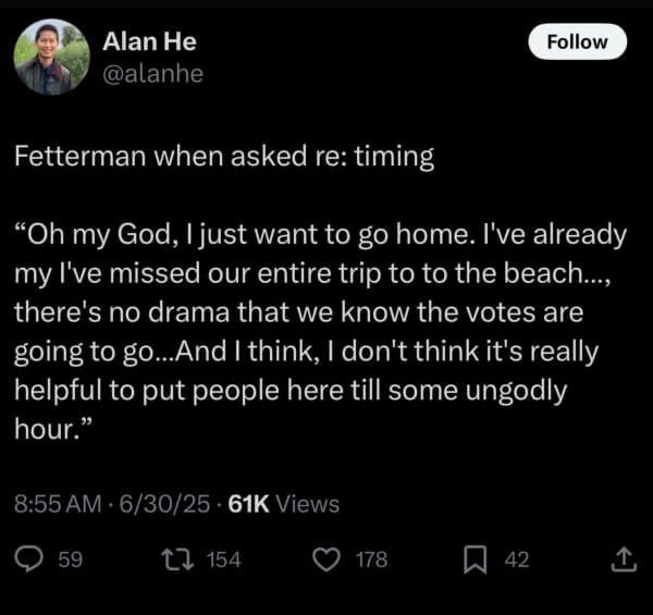 I’m very slightly sympathetic to Fetterman because he knows that it’s bullshit and at least he’s saying so. I have little sympathy for Democratic Senate leadership, which has been pretty useless. Thune is no genius. Nor is Johnson. There’s probably some smart staff in Congress who could help Jeffries and Schumer throw some sand in the gears. They’ve been stuffed in a closet since the inauguration, by a leadership that thought the smart move was to have a 99-0 vote for Marco Rubio.