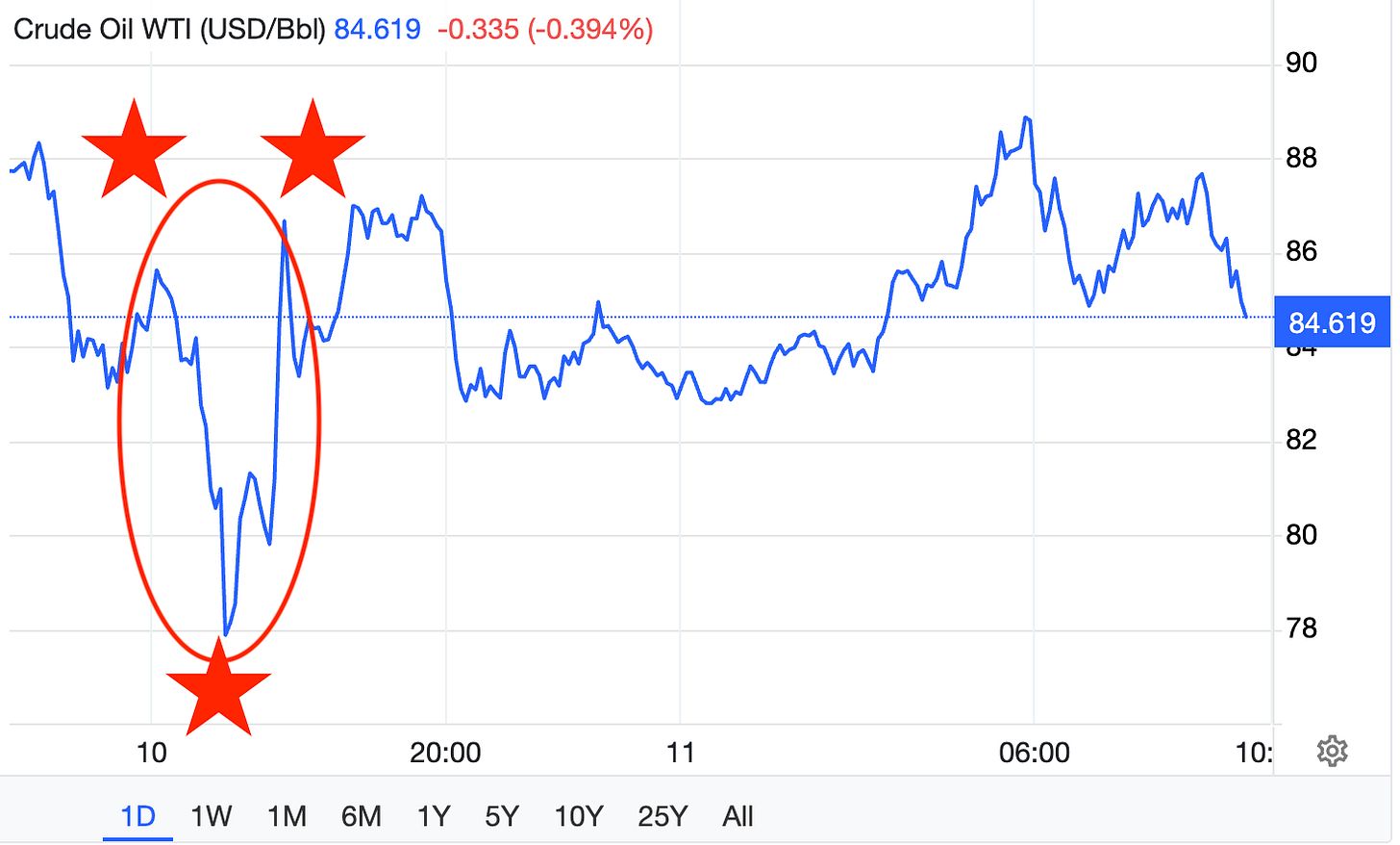Here’s a chart of oil prices yesterday, March 10, 2026. Guess what happened around the starred section: