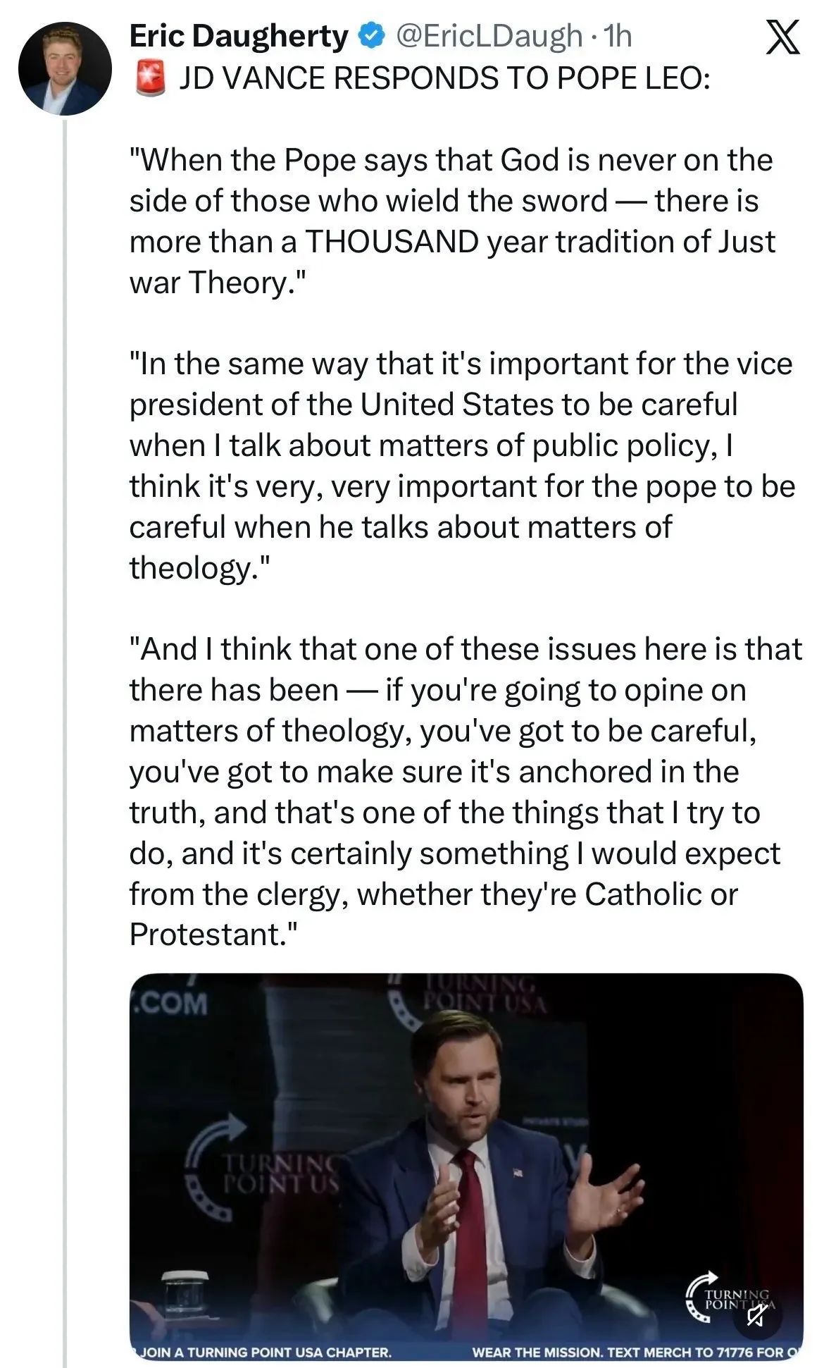 First, Vance is a prickly little asshole who acts like a first-year law student. Leo isn’t. But that’s not the big difference. The Pope of Vance’s church is infallible on matters of theology, unlike JDV, and because of another little thing called Papal Supremacy, the Pope is also the final authority in the Catholic Church. I hope that Leo will deny Vance communion, but I don’t think he’s as petty as the Klan Catholic clerics who tried to do that to Pelosi and Biden.