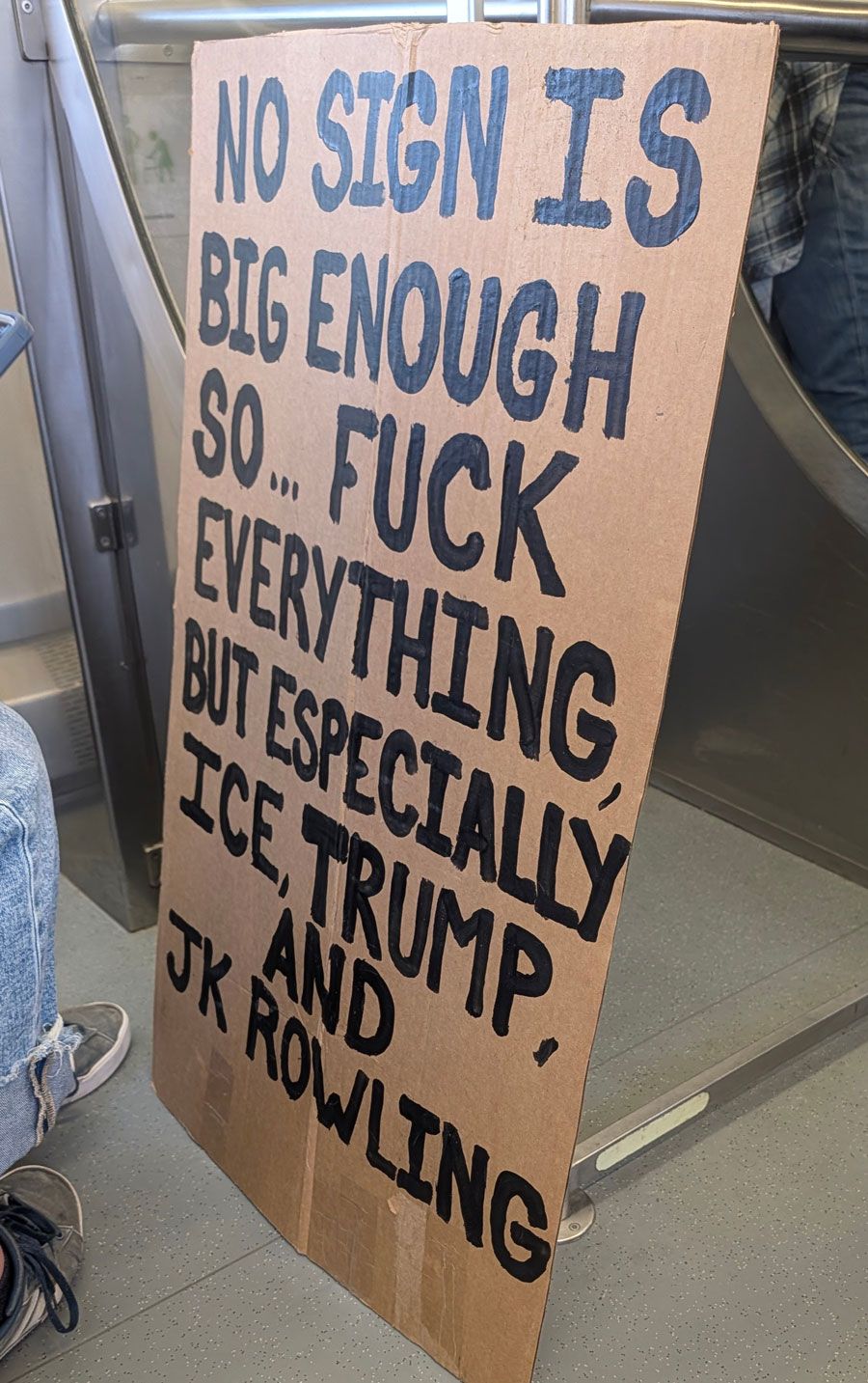 There was some discussion on BlueSky about whether No Kings protests were effective, blah, blah, blah. My take on protesting is that any and all of it is good. Plus, liberals / left / progressives have been so demonized by the right-wing media takeover that it’s good to remind everyone that we still exist. In that sense, No Kings is kind of like Pride for progressives. We’re here, we’re proud of what we believe, and we’re mad that some of us have been killed for our beliefs.