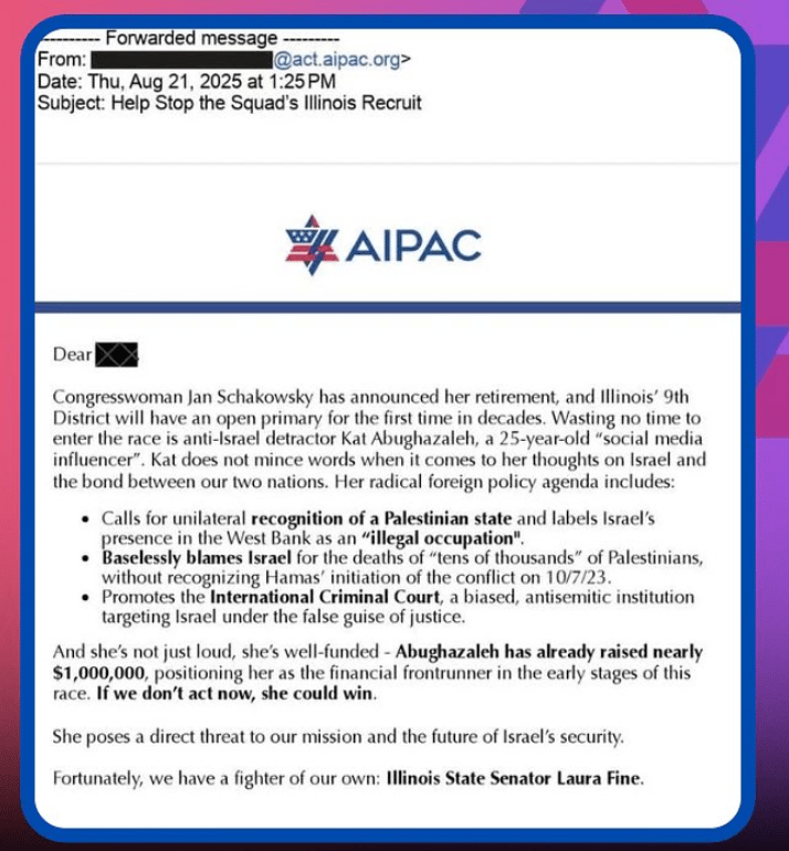 On to Kat Abughazaleh, whose name I can now spell without googling it. First, I should have posted on this earlier, but AIPAC is out for her and what they think are radical positions are interesting to me: