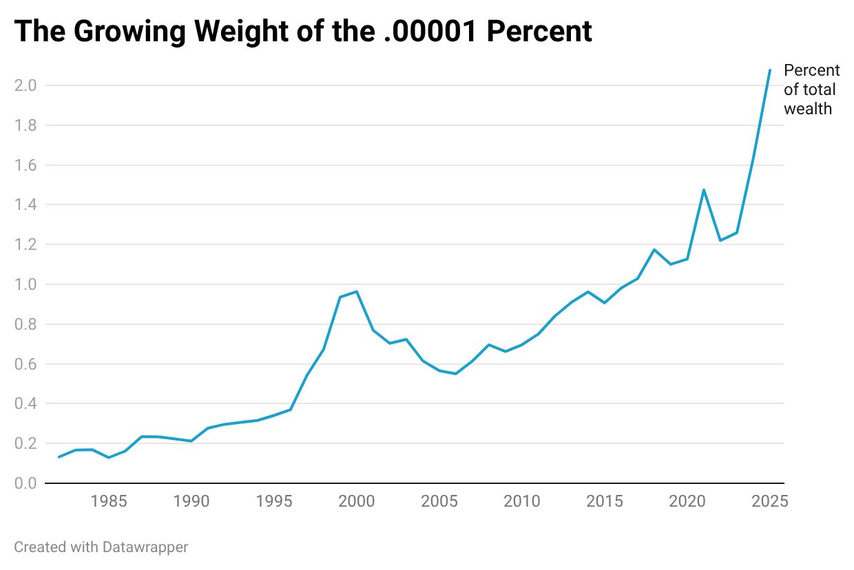 Last month I interviewed Gabriel Zucman, one of the world’s leading experts on wealth inequality (among other things.) Zucman has been producing charts on wealth at the very top — the 0.00001 percent, which currently means 19 people. He shared his latest data with me; it looks like this: