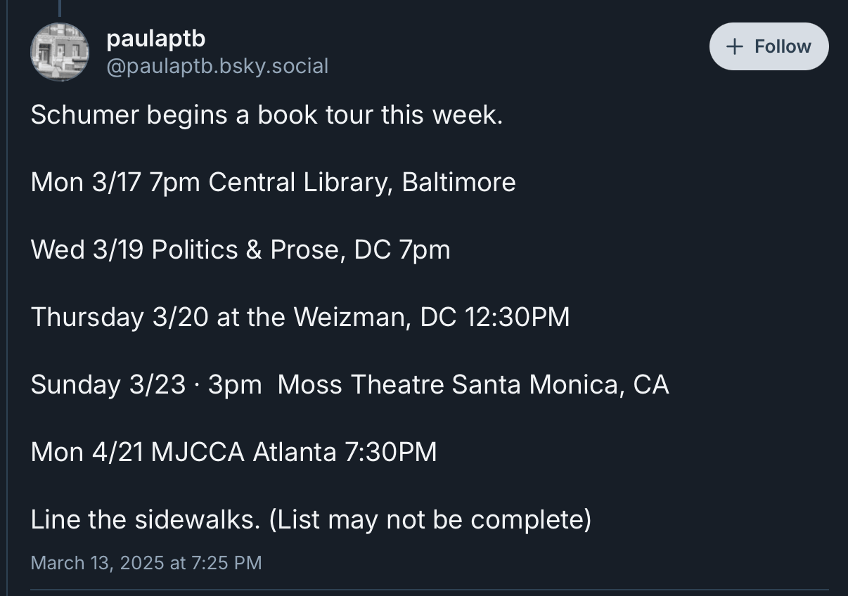To some of his constituents, it may seem as though Chuck Schumer, the Minority Leader of the US Senate, has spent a bunch of time pontificating on Bluesky lately and not enough time taking decisive action against increasing fascism in America. But this coming Tuesday he will publish a new book called Antisemitism in America: A Warning, so he’ll surely have to get off Bluesky to do some book promotion.